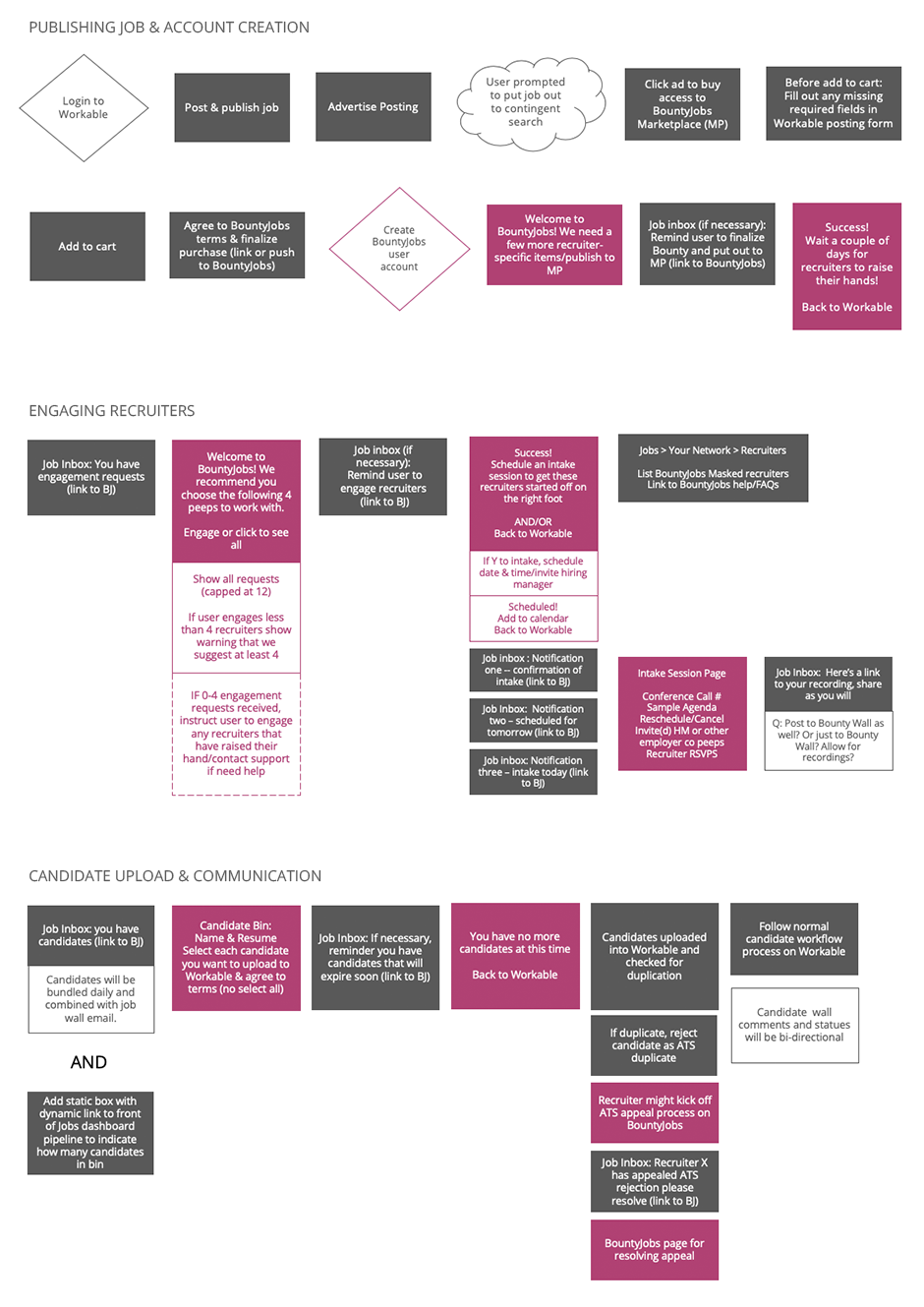 As the UX designer, my driving goal for the project was to keep from disrupting the Workable user's experience as little as possible. Initial discussions between the BountyJobs dev team (prouuct management, lead dev, UX) and Workable's dev team (business development, core developers, UX) resulted in the following integration plan: